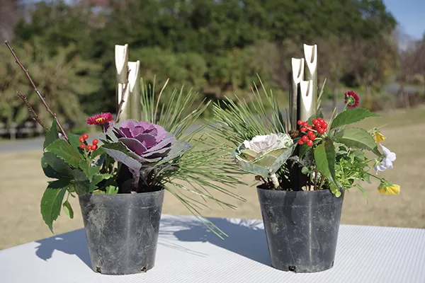 園内産の松や竹を用いて寄せ植え風のミニ門松を作ってみませんか? 一般的に縁起のいいとされる植物を寄せ植えし、新年を迎える準備をしましょう! 左右対称の対で制作します。