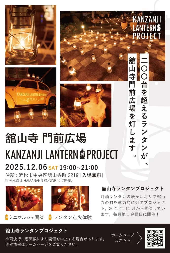 舘山寺町“かんざんじ温泉エリア”が「ランタンの光で盛り上がる!」プロジェクトを2021年11月~開催しています。灯油ランタンの本物の火の暖かい灯りのチカラで舘山寺の町をより魅力的に。